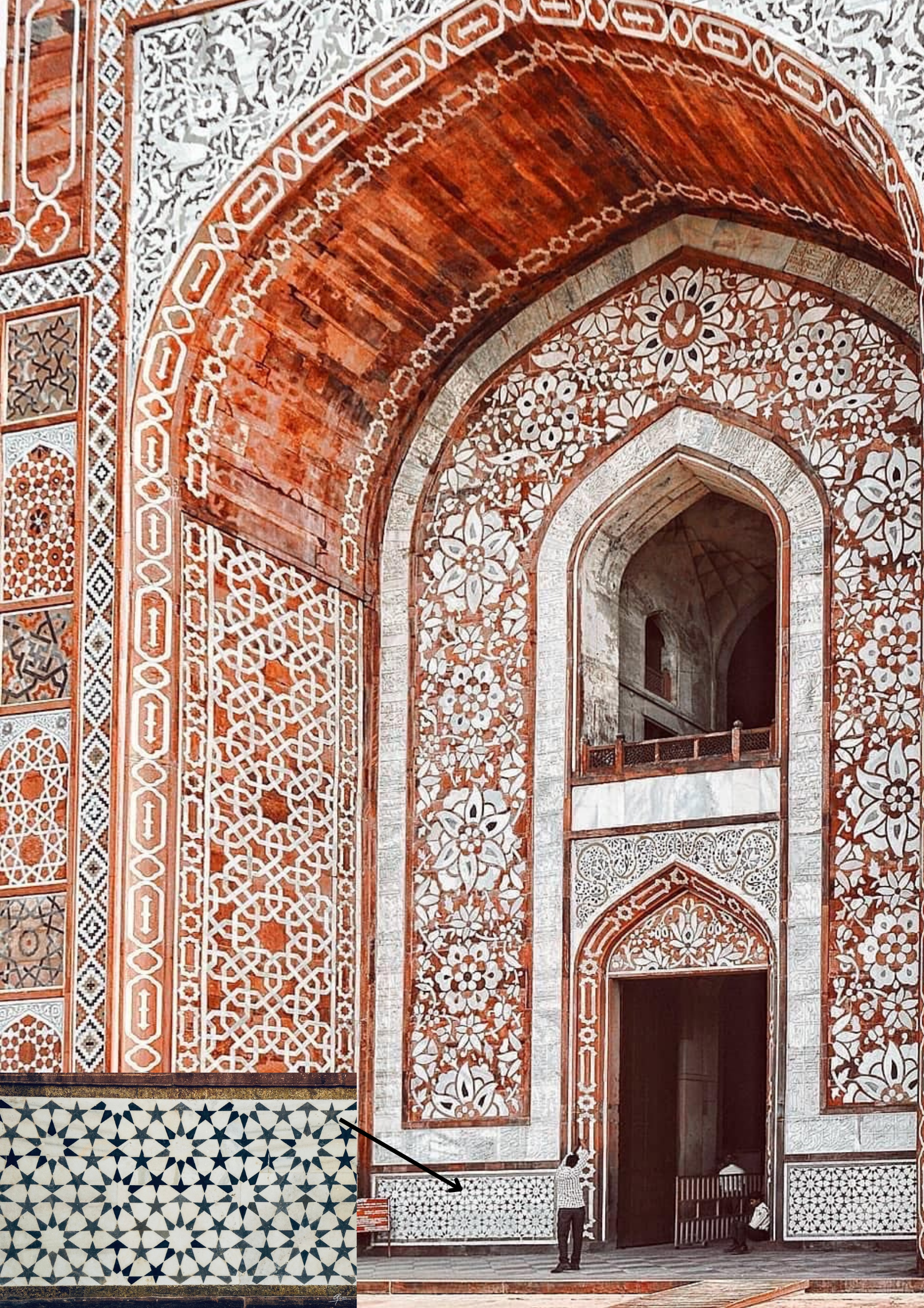 Inlaid panels of red sandstone, white marble, and black slate decorate the mausoleum and main gate buildings.